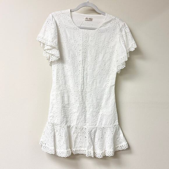 LoveShackFancy Eyelet Flutter Sleeve Ruffle Hem Mini Dress White Women's Size S