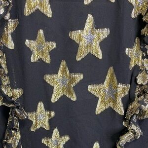 Wrap styling with side tie and hidden button closure. Lightweight fabric with gold-tone lurex star detail throughout