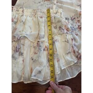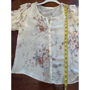 Charming floral blouse and skirt set. Features ruffled sleeves and hem. Soft cream fabric with pink floral pattern.