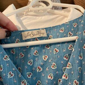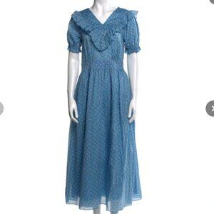 LoveShackFancy Floral Peasant Midi Ruffle Dress Blue, XS