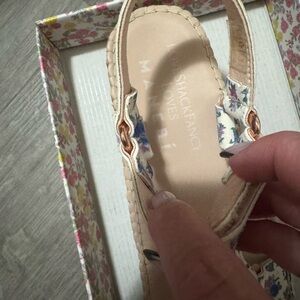Chic LoveShackFancy sandals with floral pattern. Blue and cream hues. Blue jay song. Menabi. Perfect for casual wear. NWT and box. Size 41. Fit a size 10. Bottom looks great but walked around in house to try these on. They are amazing so comfy. I just need little more platform height