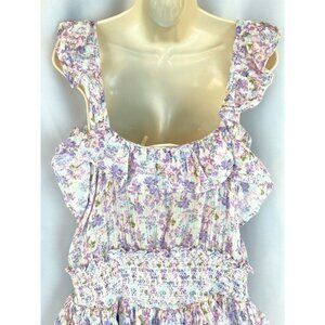 Life's a picnic in the Shanely Dress, new in textured cotton with shimmering gold lurex and a floral print. A double-ruffle lines the straps of this cute coverup, mirrored by two-layered flounces at the neckline. Buttons descend down center front to a v-shaped smocked waistband and a two-tiered flared mini skirt.