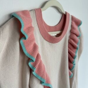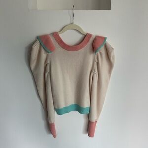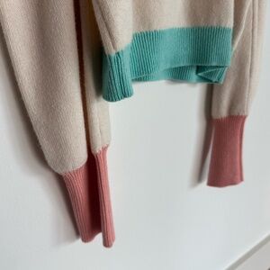 This is such a cute and colorful piece! The blush pink, teal, and cream color palette adds a gentle pop without being overwhelming. The fit is slightly cropped, making it great for pairing with high-waisted jeans or skirts.
