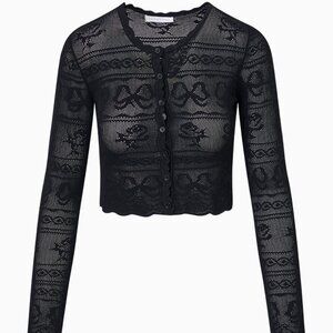 Add a chic layer to your look with the Gretta Cardigan. The charming knit arrives with nice stretch yarn featuring a stunning pointelle jacquard. Patterns of bows and florals are placed throughout the body. With a slim fit, the sweater features a ribbed scallop placket, placed bow and flower motifs, and our custom faux shell buttons.