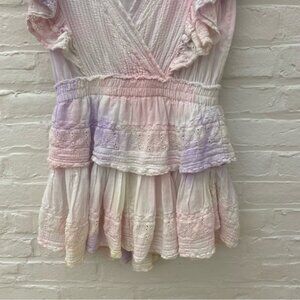 LoveShackFancy || Gwen Mini Dress Tie Dye Eyelet Ruffle V-neck Pink Large