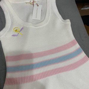 This scallop-trim minidress features embroidery at chest and striping at waist.