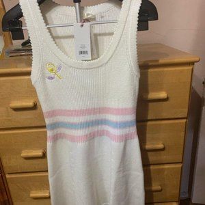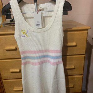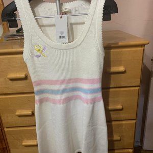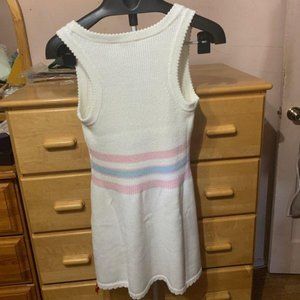 This scallop-trim minidress features embroidery at chest and striping at waist.