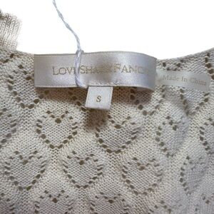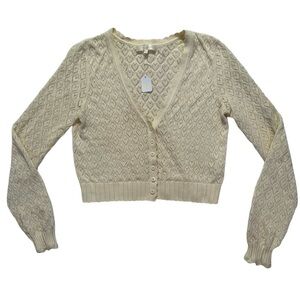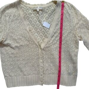 LoveShackFancy Janie Cropped. The Janie Cardigan is sweet as can be in 100% organic cotton heart pointelle knit. This lightweight sweater is perfect dressed up or down with its scallop trimmed v-neck, mother-of-pearl buttons down center front and ribbed cuffs at sleeve opening and cropped bottom hem.