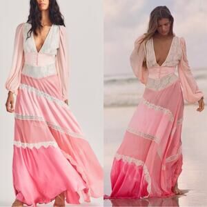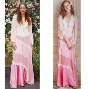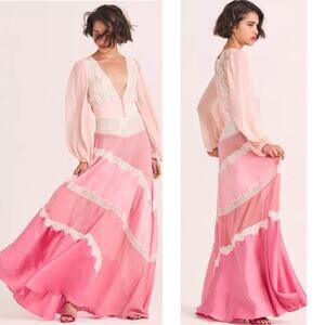 LoveShackFancy Kinsler Colorblock Satin Lace Long Sleeve Pink Maxi Dress Size 0
