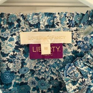 Delicate floral design with blue and white tones. Ruffle sleeve and button detail.