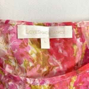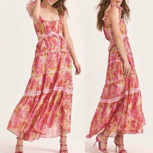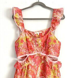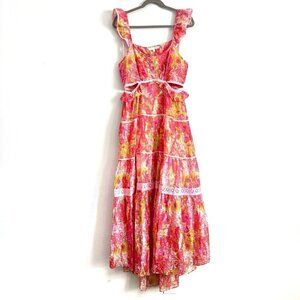 LoveShackFancy Madsen Dress, women’s size large! Pink floral watercolor pattern, flutter straps, cutout waist, high-low skirt hem.