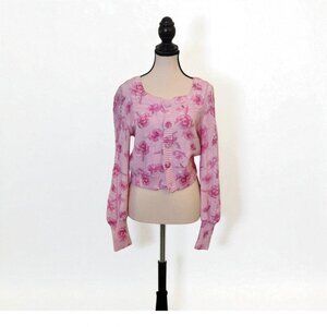 The Mikki Crop Sweater is featured in a delightful Pink Dream Fields color, evoking a whimsical feel. With a length of approximately 17 inches from shoulder to hem, it offers a flattering fit that accentuates your silhouette. The sweater showcases exquisite design details, including a reversible knit that adds versatility to your styling options. The pointelle cable and vine cable along the neckline add a touch of elegance to this charming piece. For added convenience, the Mikki Crop Sweater features a stylish button front closure. Made from 100% cotton, it ensures comfort and breathability throughout the day. To maintain its beauty, simply hand wash this sweater. It is imported, reflecting LoveShackFancy's dedication to quality craftsmanship. Elevate your style with the LoveShackFancy Mikki Crop Sweater, a perfect blend of romance and fashion-forward design.