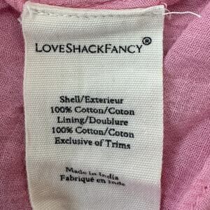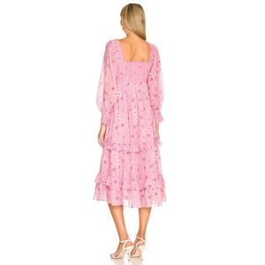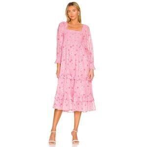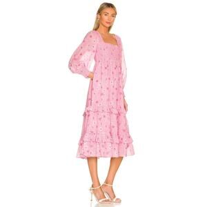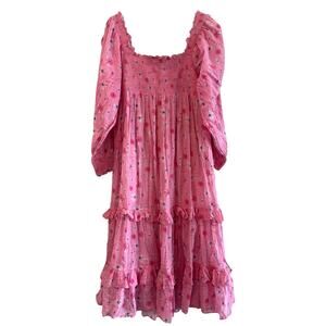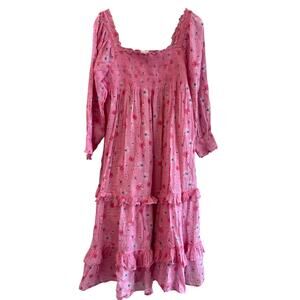 LoveShackFancy Miri Dress in Pink Blaze. Size XL / Extra Large. Features pull-on styling, smocked babydoll bust, long sleeves with smocked cuffs, side seam pockets, square neckline, lightweight fabrication with tiered ruffle trim, long sleeves, midi length. 100% cotton. Style LESH-WD535. Excellent condition, no flaws.
