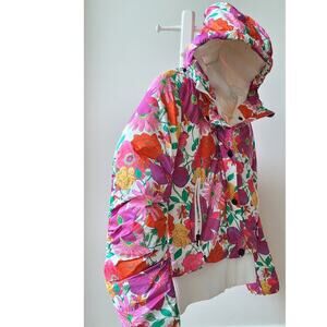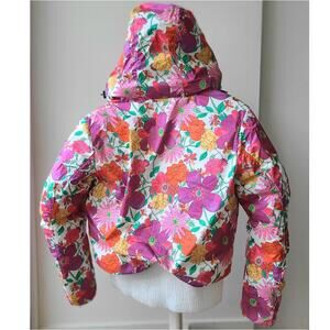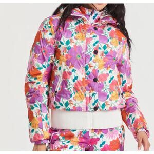 New with Tags -- LoveShackFancy x BOGNER FIRE + ICE Sella D bomber-style winter water repellent down ski jacket with hood. Colorful, bright, and stylish floral print on a lofty, lightweight, puffer coat.