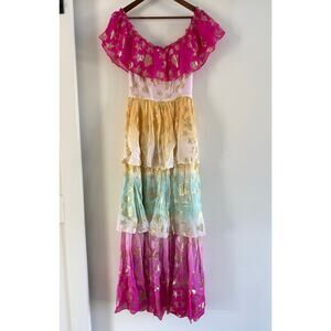 Xsmall, off the shoulder, tiered maxi dress, ruffle dress, metallic burnout, star print, heart print, ombre, colorblock, pink and gold, resort wear, vacation outfit, summer dress, designer dress, cruise, high slit, party dress, wedding guest, special occasion, luxury bohemian, flowy dress, tiered ruffle, long dress, neon, rainbow