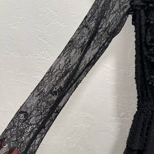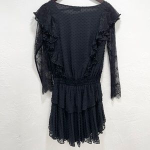 Condition is pre owned. No holes or stains. Love Shack Fancy Nat Dress Black features a light silk Swiss dot fabric with beautiful floral motif lace to create the perfect day to night piece. The Nat dress has an easy, elegant silk Swiss dot body cinched at the waist with elastic and flattering ruffle mini skirt. Ruffles cascade from atop the shoulder down the princess seams in floral lace finished with tiny dot trim. Sleeves are slim and sheer in lace.