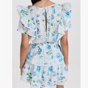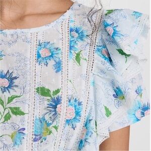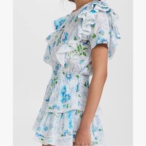 Chic floral dress with ruffle details. Features vibrant blue and green flowers. Worn once.