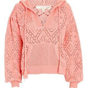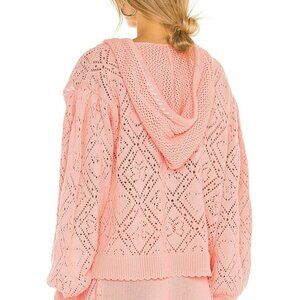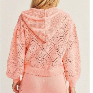 A new spring staple from LoveShackFancy, the Tomaso Hoodie is an open knit hoodie with beautiful detailing throughout. Knit with cherry and flower pointelle motifs, featuring a cozy hoodie for a cotton clad take on loungewear. Coming in a beautiful peach colorway, this can be worn over jeans and also makes a great beach knit, throw it on over a bathing suit and you’re ready to go!