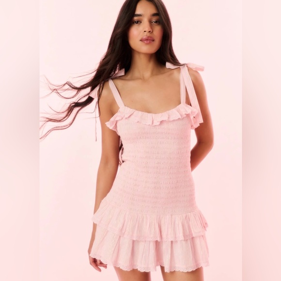 Complete with textural smocking throughout, this soft pink mini dress by LoveShackFancy is finished with vintage-inspired ruffled lace trim and self-tie straps.