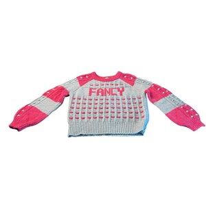 Chic LoveShackFancy sweater with bold pink accents. Features playful pink dots and 'Fancy' text. Ideal for a stylish look.