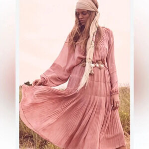 Accented with a diamond-pattern of gathers at the bodice. The long, swingy skirt is detailed with tiny, crisp pleats. Long dolman sleeves with elastic cuffs. Hook-and-eye back closure. Hidden elastic waistband. Lined skirt. Raw trim. In color Faded Marsala. Georgette fabric.