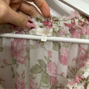 Popover silk dress by LoveShackFancy. Iconic piece. Delicate and airy piece. Neckline with an adjustable drawstring. You can reveal your shoulders. Neckline with a flounce. Elastic waist. Long sleeves finished with ribbings. Hand-painted flowers.