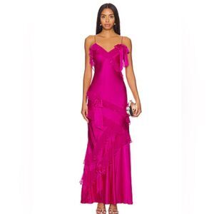 Designed with a silk charmeuse fabric, the dress features bows placed throughout for an added touch of love. This must-have maxi stuns with overlapping, asymmetrical ruffles at the neckline that continue to descend through the entire skirt. Slightly fitted, this dress features a sexy silhouette and includes a side seam zipper for closure