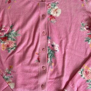 Size XS. Color is Pink Parade. Tags removed and tried on, but I don’t think I ever wore this. Wrinkles from storage. Front button closure. Beautiful floral cardigan!