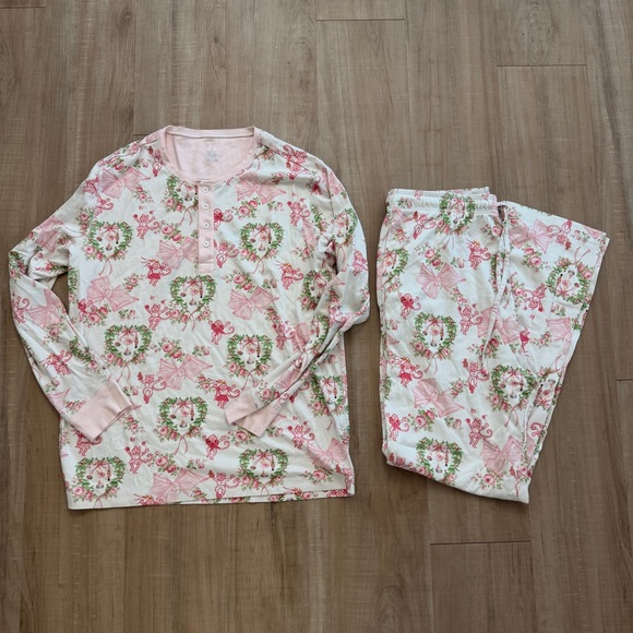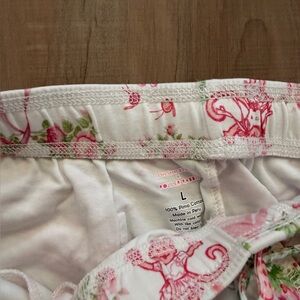 Roller Rabbit lsf collab from last year. Festive winter print, nutcrackers, wreaths, bows and the classic roller rabbit monkey! Pink cuffs & pink trim.