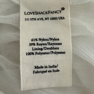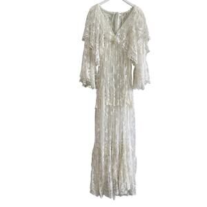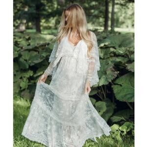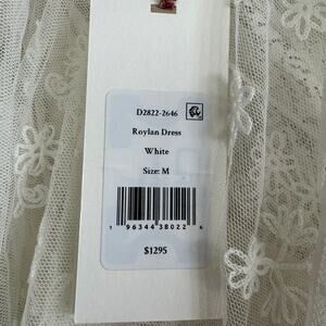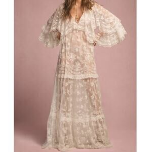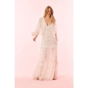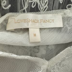 LoveShackFancy Roylan Lace Mesh Maxi Dress in White. Size M / Medium. Features v-neckline, lightweight mesh fabrication, detachable and adjustable slip, long bell sleeves, embroidered floral design throughout, back tie closure, scalloped lace trim, maxi length. 61% nylon, 39% rayon. Style D2822-2646. Brand new, never worn, NWT / New With Tags.