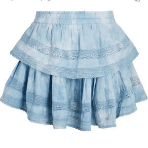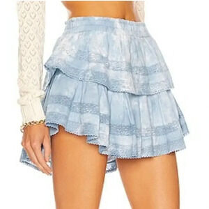 Falling in tiers of lace-trimmed hand dyed cotton, the label's ruffled mini skirt is the effortless answer to warm weather styling. Elasticized waistband. Pull-on style.