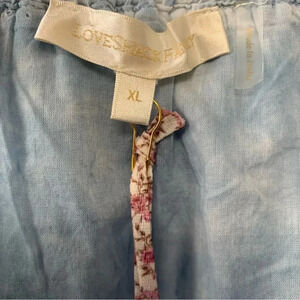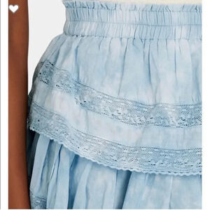 Tiered ruffled blue hand dyed mini skirt with lace detail. Gauzy material with raw edging on elasticized waistband.
