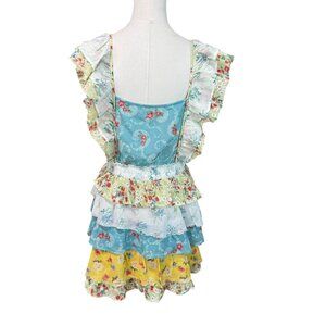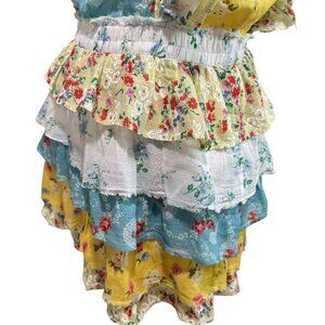 Whimsical and romantic, this pre-loved LoveShackFancy dress is a patchwork dream of vintage-inspired floral prints. Featuring tiered ruffle layers in pastel hues of yellow, blue, white, and green, it’s a standout piece perfect for spring and summer. The dress has delicate lace accents, ruffled straps, a buttoned bodice, and a stretchy smocked waist for a flattering, feminine silhouette.