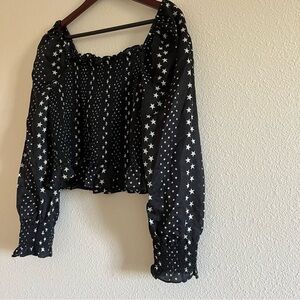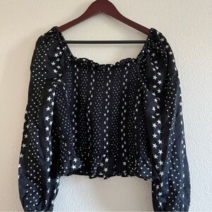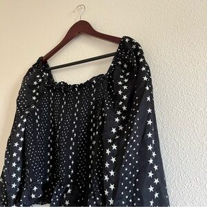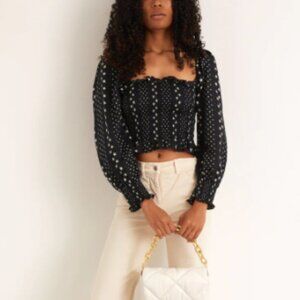 Meet Love Shack's Russell Top, brand new in a cotton-silk blend with a scaled stars and stripes print. Skies the limit in this semi-cropped top with a wide open, elastic-encased neckline (worn on- or off-the-shoulder). The puffed sleeves finish with smocked cuffs at opening, mirrored by the smocked bodice. Pair it with Love Shack's Ruffle Mini Skirt. Shown here in Black Satin.