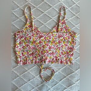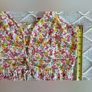 Sweet things for spring. The Sarai Cami from LoveShackFancy is a heart pointelle cotton knit a delicate all-over floral print. This cropped tank features adjustable spaghetti straps, a v neckline, and a peplum ruffle at the bottom.