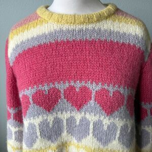 An instant classic in lambswool with a color-blocked motif, this easy LoveShackFancy sweater has an oversized fit with heart-themed panels crossing the bodice.