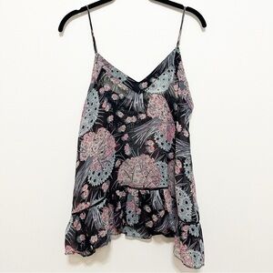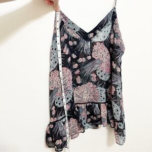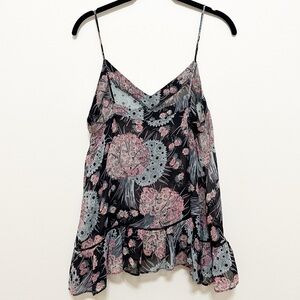 Beautiful Y2K inspired 100% silk black floral babydoll top. This blouse is gorgeous it has thin 2000s style spaghetti straps with a ruffled bottom hem line and faint lace detail near bottom. Very flowy and feminine.