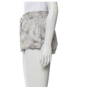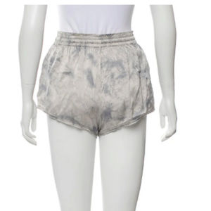 LoveShackFancy Pale blue and white silk mini shorts featuring watercolor print throughout and drawstring closure at waist. There's some minor fraying at the waist but does not affect the wear of the shorts.