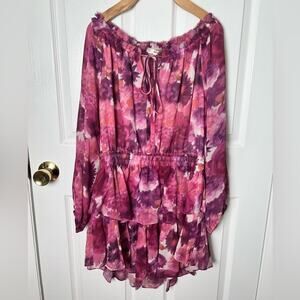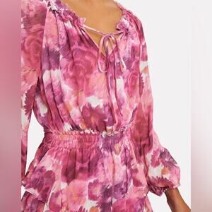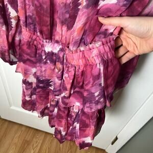 LoveShackFancy Silk Pink Smocked Waist V Neck Frill Popover Floral Mini Dress L