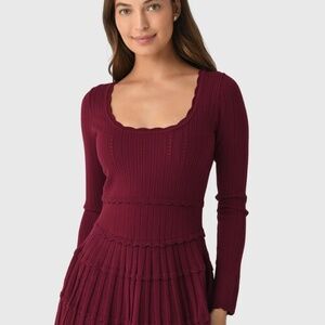 This charming pointelle knit dress is a delightful addition to your wardrobe, perfect for cooler weather. The skirt cascades from the waist in three playful, tiered ruffles with a scalloped edge, creating a flouncy and fun silhouette.