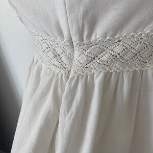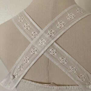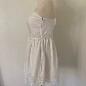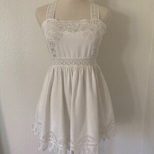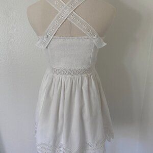 Made for easy, breezy beach days. This airy mini steps onto the scene in a new fabrication with engineered custom battenburg lace. The dress begins with functional, lace-adorned straps fastened onto a square neckline leading to a fixed waist above a lightly ruffled skirt with eyelet embroidery on the trim. The dress includes elastic and a side seam zipper.