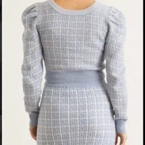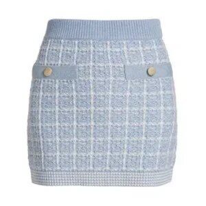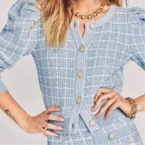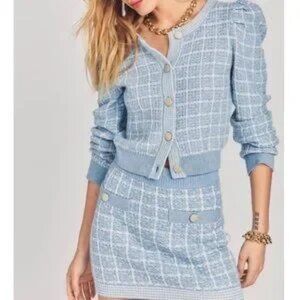 ♥️LoveShackFancy BabyBell Blue & White Gold Lurex Buttons Checked Tweed Knit Sweater Daughter Cropped Cardigan Jacket & The Callington High Rise Mini Skirt♥️