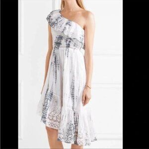 This beautiful bohemian midi dress from LoveShackFancy features one shoulder top, white and blue lace, A-line skirt, and is 100% Cotton. It's a comfy and upscale designer dress that makes a statement! Lined, side zipper closure.