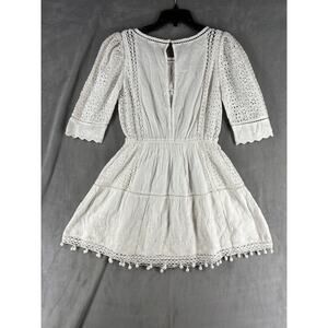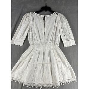 Elegant white mini dress. Features lace detailing. Perfect for any occasion.