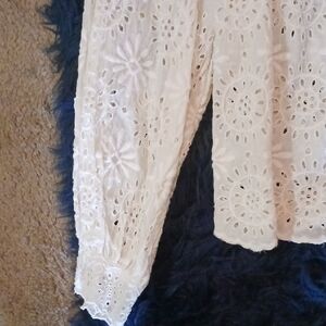 This elegant white blouse by LoveShackFancy showcases a relaxed fit with long sleeves and a charming tie front. The embellished details add a sophisticated touch, making it perfect for both casual and formal occasions.