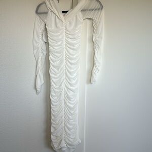 LoveShackFancy, white dress, ruched dress, long sleeve, bridal dress, wedding guest outfit, romantic dress, elegant dress, special occasion dress, bachelorette, bridal shower, chic fashion.