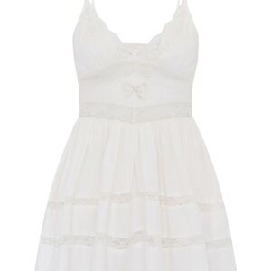 This stunning white mini dress by LoveShackFancy features a ruched bodice and ruffled tiers, perfect for a wedding guest or cocktail occasion. The sleeveless design with spaghetti straps and a plunging neckline adds a touch of elegance to its sundress style.