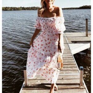 Love Shack Fancy and Target collaboration dress. White in color with small pink florals. Tiered. Smocked bodice. Off shoulder puff sleeves. Lace accents. Cottagecore. Size Small