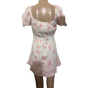 Elegant mini dress with pink floral patterns. Features a square neckline and lace hem. Ideal for casual outings.