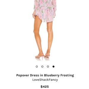 LoveSchackFancy popover dress in blueberry frosting size M. New without tags. Ruffle-trimmed split neck with tie detail. Long sleeves with elasticized cuffs and be worn on or off-the shoulders. Smocked elasticized waist and lined tiered ruffle skirt. 100% viscose pullover style. Dress has never been worn and is in excellent new condition.
